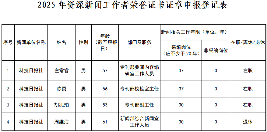 根據(jù)中華全國新聞工作者協(xié)會《關(guān)于2025年資深新聞工作者榮譽(yù)證書證章申報(bào)工作的通知》等要求,為表彰長期工作在新聞采編業(yè)務(wù)崗位的資深新聞工作者,現(xiàn)將科技日報(bào)社在職及退休人員中申報(bào)資深新聞工作者榮譽(yù)證書證章人員名單進(jìn)行公示。