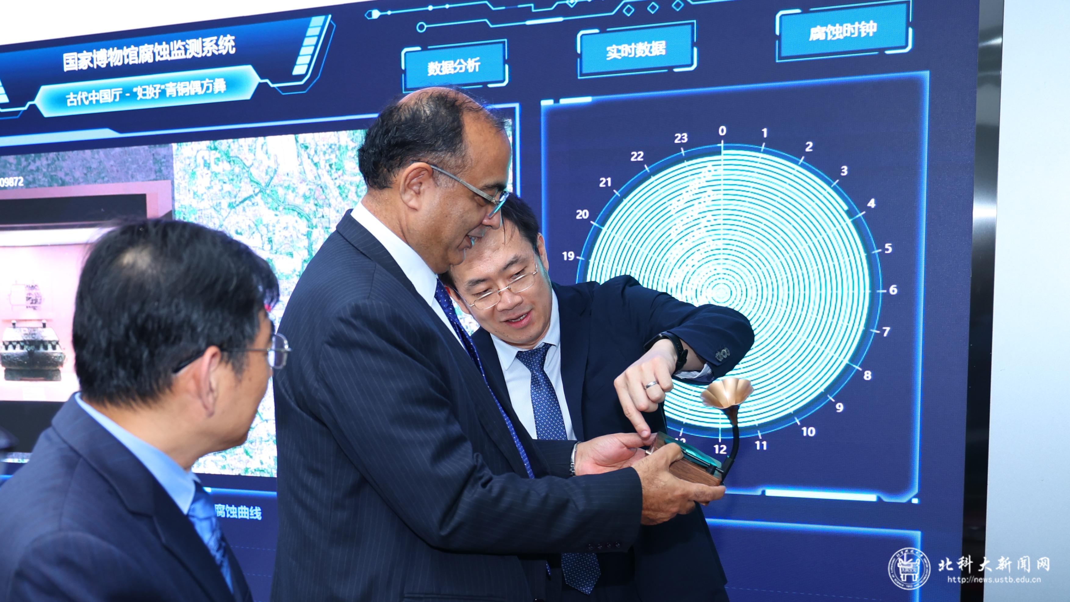 Prof. Shahbaz Khan?(middle), director of UNESCO Multisectoral Regional Office for East Asia, visits USTB's national center for materials corrosion and protection science. (PHOTO: USTB)