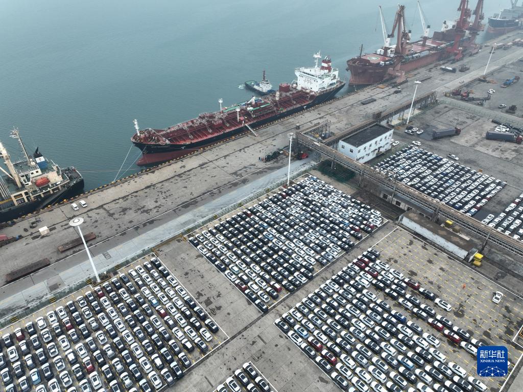 一艘滿載著出口商品車的滾裝船駛離山東港口煙臺港(2023年1月9日攝,無人機照片)。新華社發(fā)(唐克 攝)