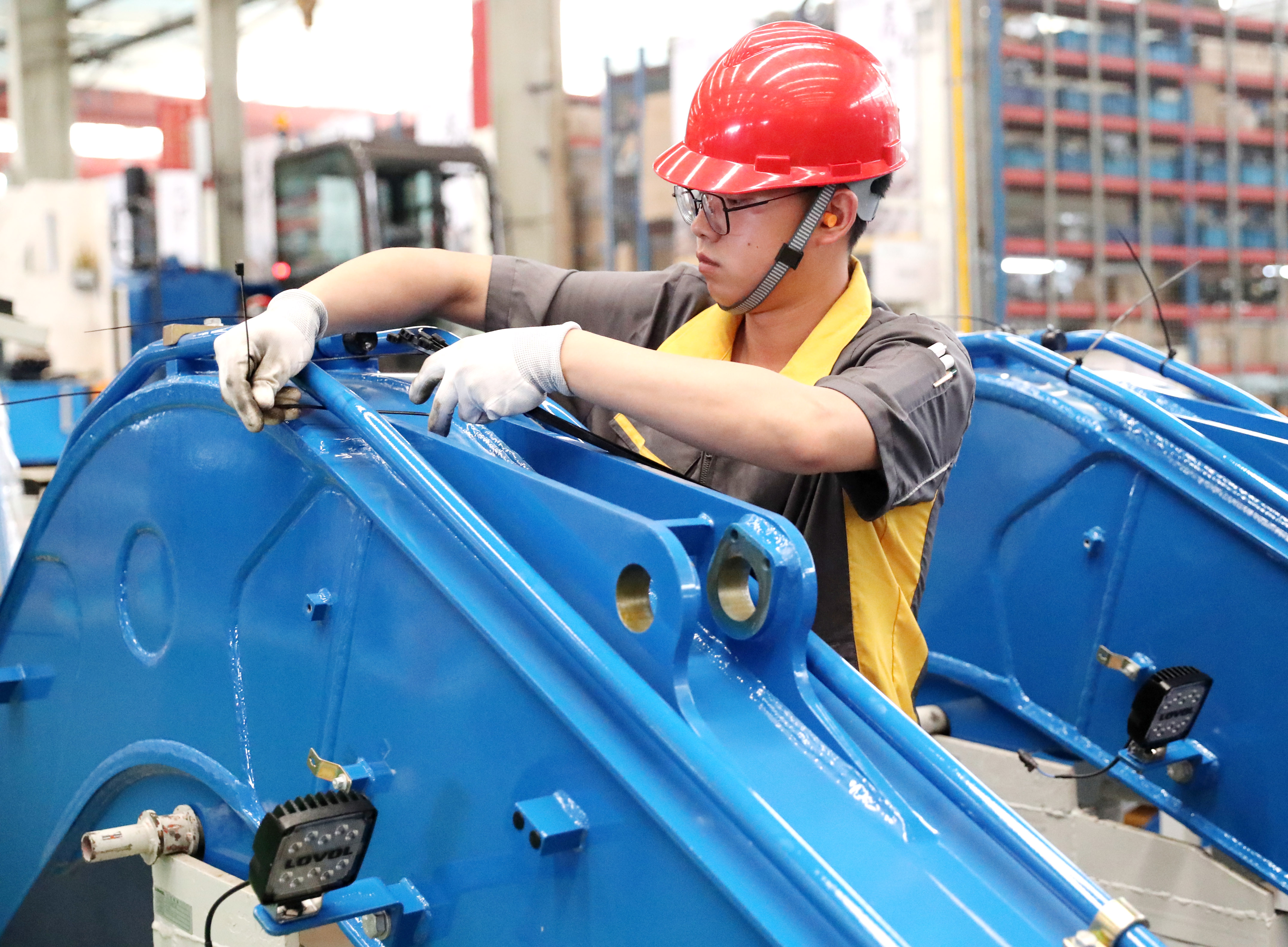 6月14日,雷沃重工集團有限公司生產車間里,工人在進行挖掘機大臂分裝。張進剛 攝