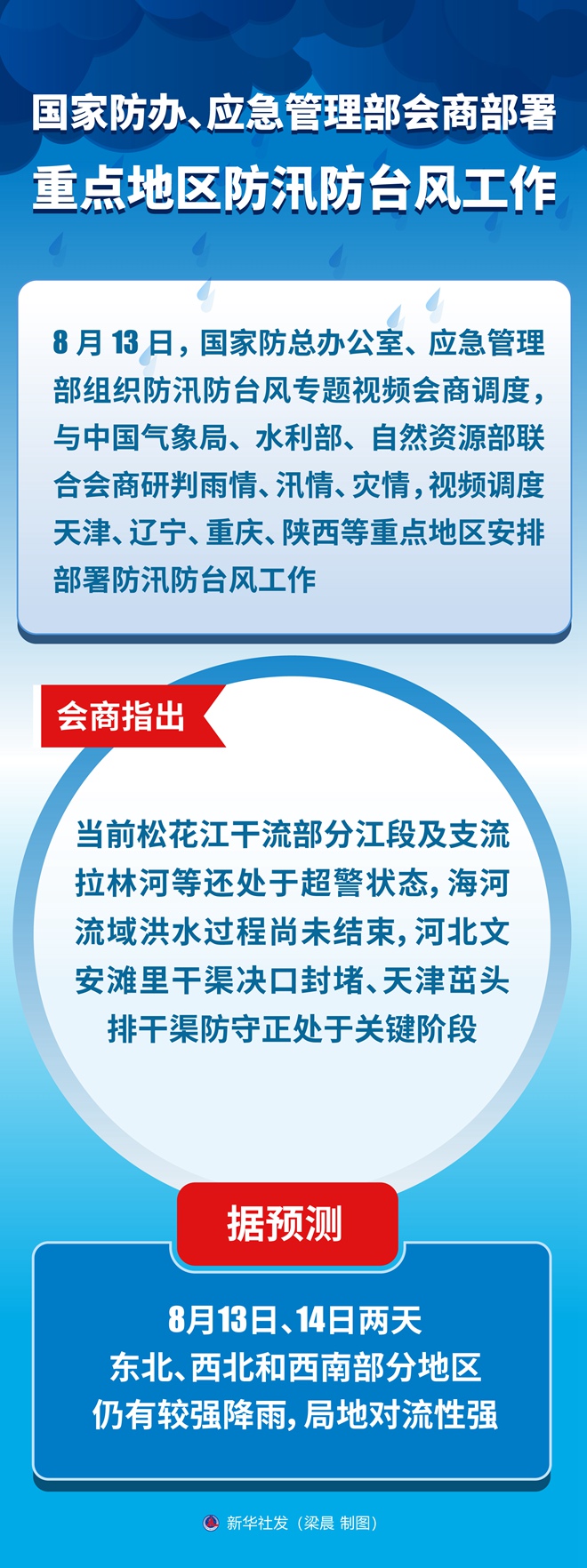 會商指出,當前松花江干流部分江段及支流拉林河等還處于超警狀態,海河流域洪水過程尚未結束,河北文安灘里干渠決口封堵、天津茁頭排干渠防守正處于關鍵階段。據預測,今明兩天東北、西北和西南部分地區仍有較強降雨,局地對流性強。