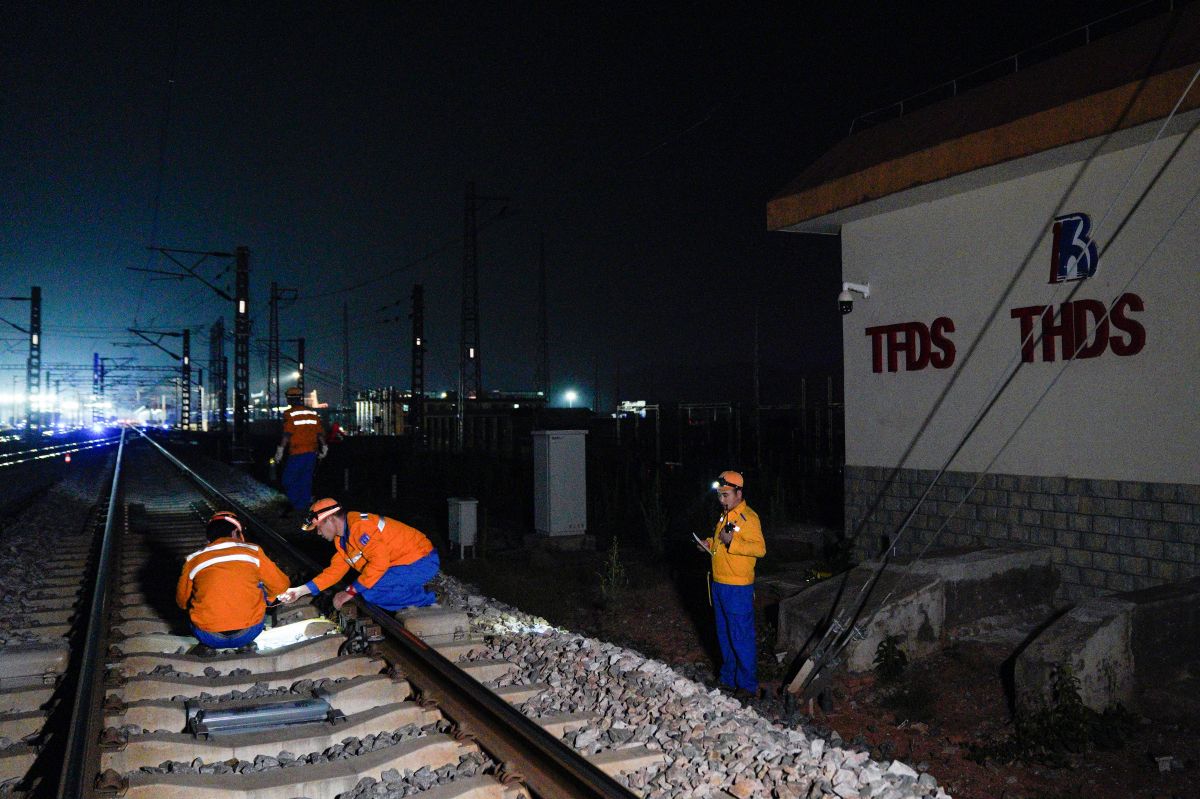 在中國鐵路昆明局集團公司昆明北車輛段動態檢測車間昆東組,一群身著藍黃相間衣服的5T設備檢車員正沿著線路行進。他們當晚的任務是檢修一臺特殊的鐵路貨車運行故障動態圖像檢測設備——TFDS探測站,確保其正常運行。?