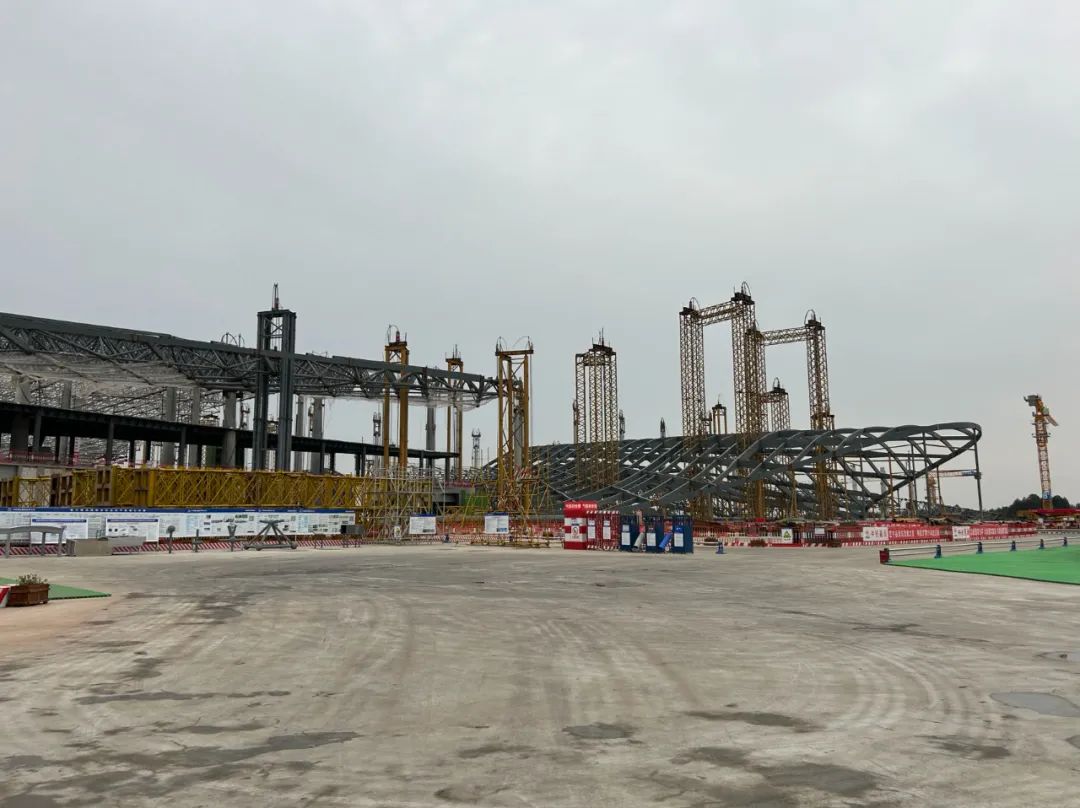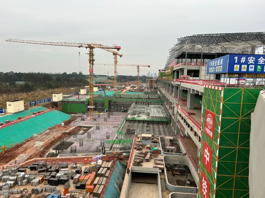天府站是四川省首個以TOD(公共交通為導向)的綜合鐵路站,總體流線為上進下出,地上三層、地下二層,多條高鐵與地鐵、高鐵與公交無縫對接換乘,是成都鐵路樞紐規劃中的綜合性交通樞紐之一。第一階段站臺層及以下主體結構工程已于去年4月完成,目前正在進行站臺層以上第二施工階段。