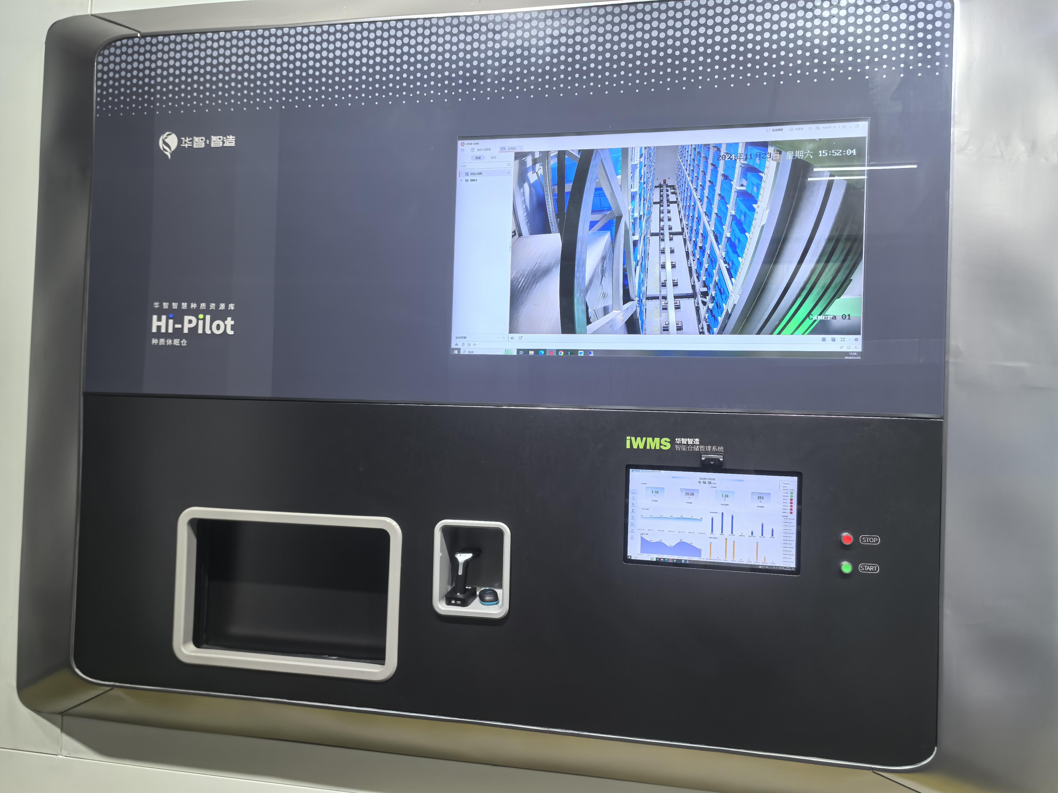 在華智生物展示區,一個自動化、信息化的智能種質休眠艙十分引人注目。操作人員只需要在屏幕上輕輕點擊,便可對庫內各項數據進行實時監控,其還具備貨架管理、種質管理、設備管理等功能。
