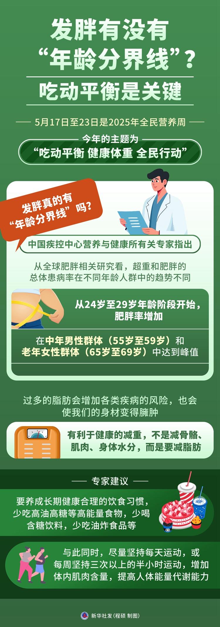 5月17日至23日是2025年全民營養(yǎng)周,今年的主題為“吃動(dòng)平衡 健康體重 全民行動(dòng)”。根據(jù)中國疾控中心近日發(fā)布的健康科普,隨著年齡增長,人體基礎(chǔ)代謝率下降,應(yīng)通過合理飲食和堅(jiān)持運(yùn)動(dòng)相結(jié)合,長期控制好體重。