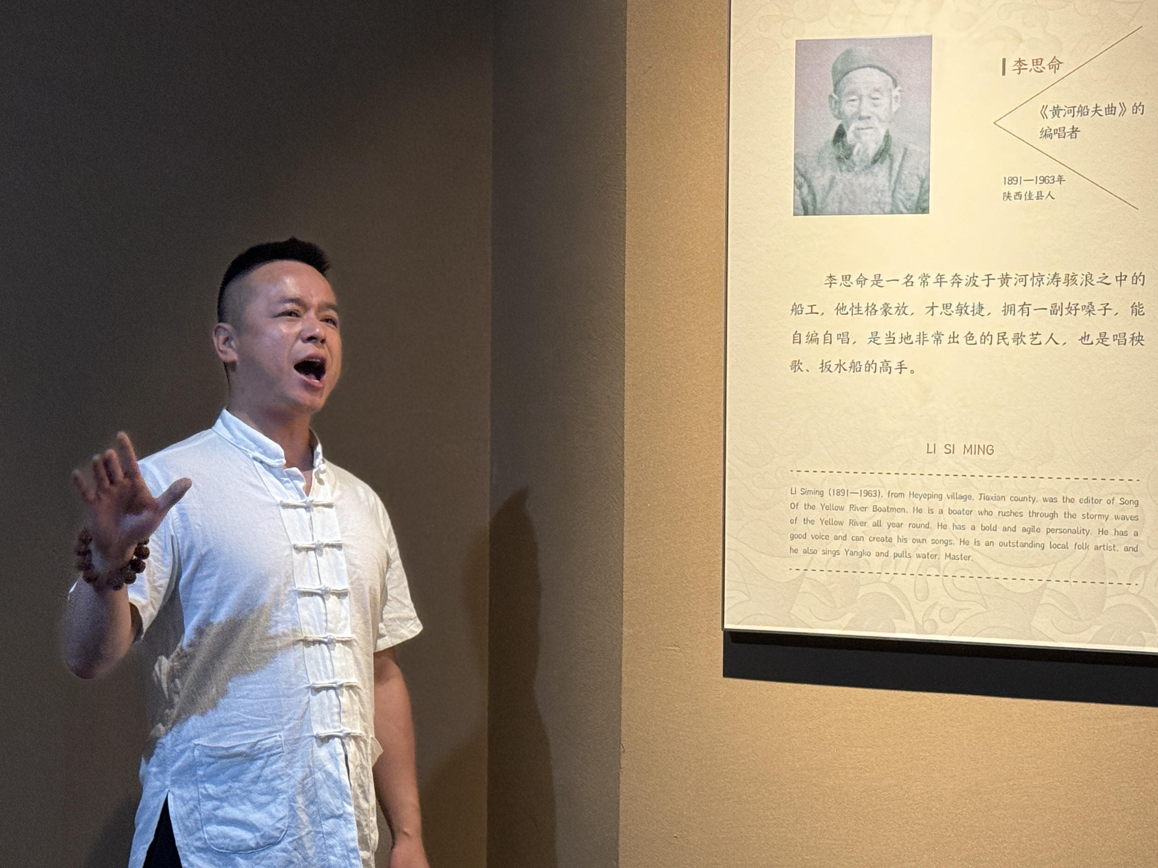 “你曉得天下黃河幾十幾道彎……”陜北民歌博物館演唱老師王志行一開嗓,游客立刻被“釘”在原地。他沒有拿擴音器,也沒有介紹展品,而是站在一幅黃河奔騰的全息投影前,用一曲《黃河船夫曲》把所有人“拽”進了黃河岸邊的纖夫勞作現(xiàn)場。