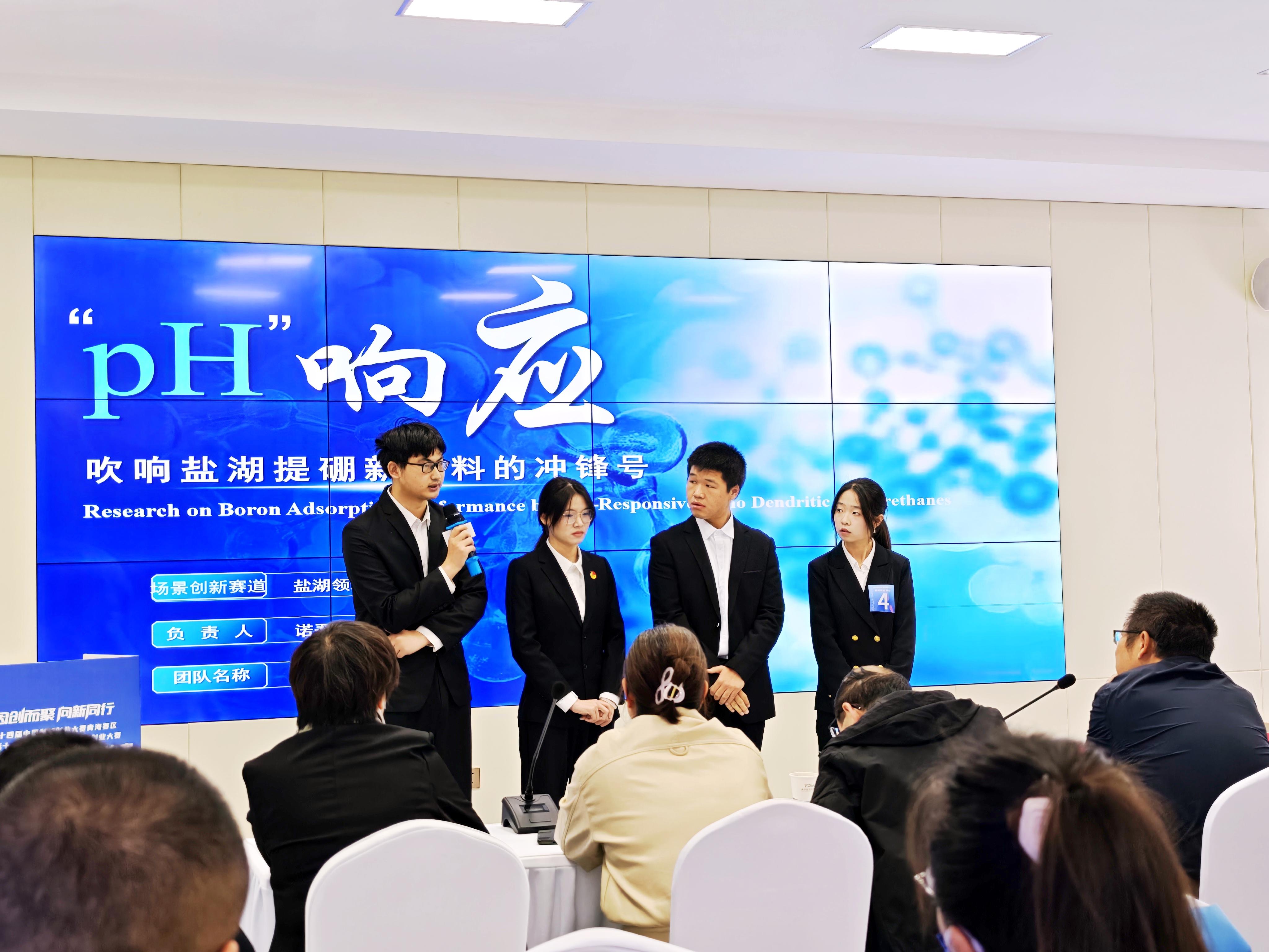 在鹽湖領域特別賽道決賽上,青海師范大學“先行響應”團隊在指導教師陳渭的指導下,帶來了參賽項目“pH響應——吹響鹽湖提硼新材料的沖鋒號”。