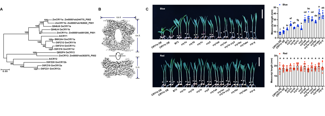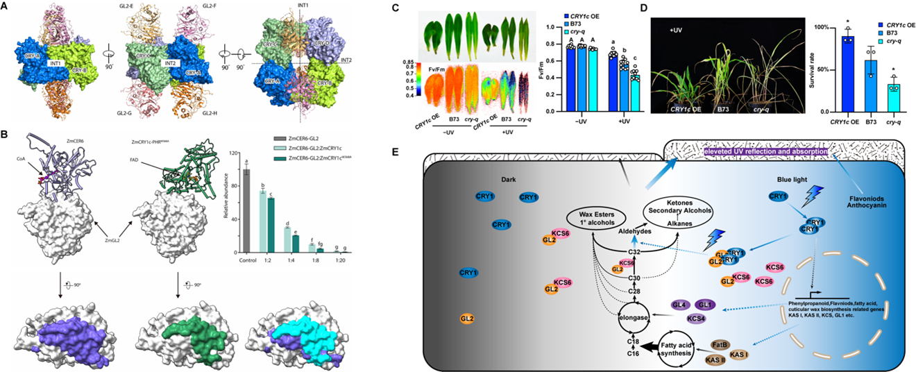 該成果不僅解析了植物抗逆的新機制,更蘊含多重創新突破,為培育更耐曬的高光效玉米品種提供了關鍵靶點。劉宏濤教授團隊還與中國科學院分子植物科學卓越創新中心張鵬研究員合作解析了ZmCRY1s-GLOSSY2蛋白復合體結構,近期發表于《科學進展》,為光信號傳遞的分子基礎提供直接證據。