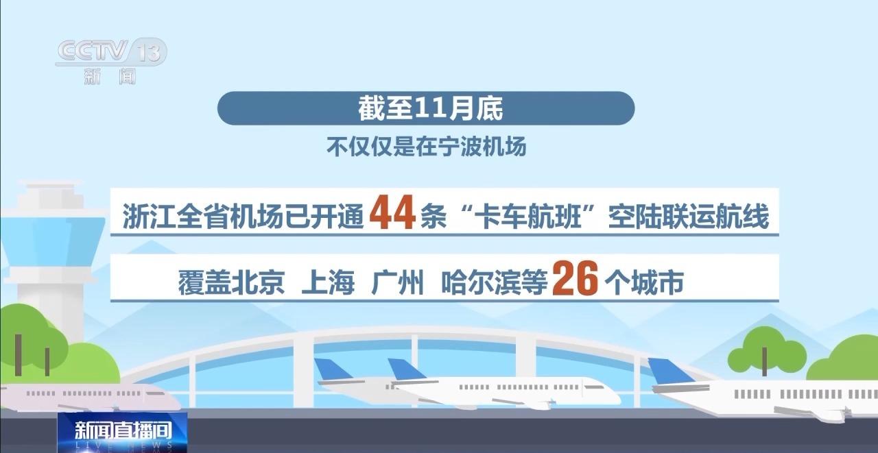 不僅僅是在寧波機(jī)場(chǎng),截至11月底,浙江全省機(jī)場(chǎng)已開通44條“卡車航班”空陸聯(lián)運(yùn)航線,覆蓋北京、上海、廣州、哈爾濱等26個(gè)城市。同時(shí),空空中轉(zhuǎn)、空海聯(lián)運(yùn)等“空-海-陸”一體化、可按需組裝的多式聯(lián)運(yùn)服務(wù)體系正在加速形成。