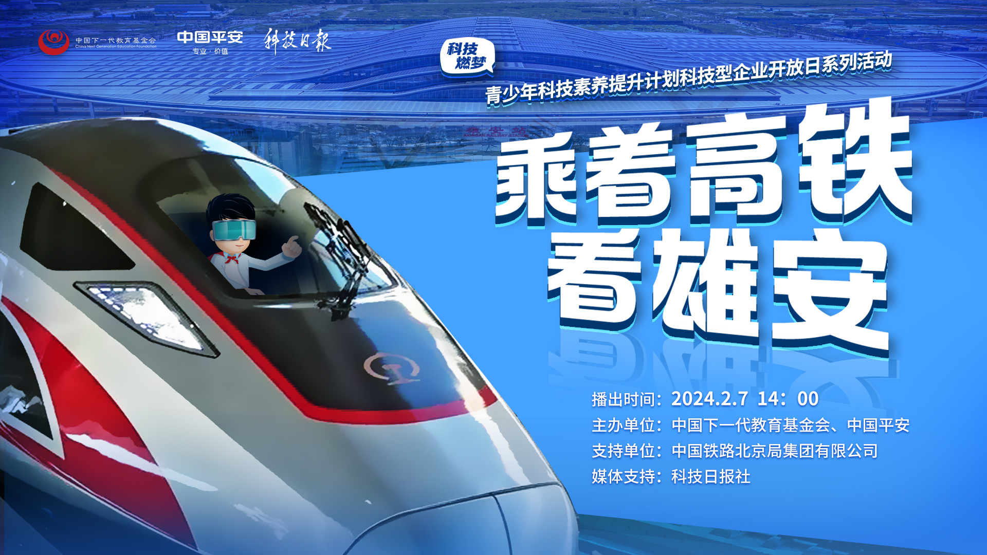 作為京津冀區域一體化的典范,雄安站是智能化、綠色化的現代交通標桿。2月7日14:00,和青少年科技素養提升計劃的孩子們乘上高鐵看雄安,一起領略雄安站的科技范兒。