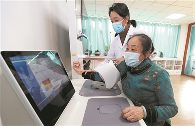 山東省東營市東營區(qū)黃河路街道玉景社區(qū)黨群服務(wù)中心內(nèi),醫(yī)護(hù)人員指導(dǎo)社區(qū)老人使用智能體檢一體機(jī)自助查體。